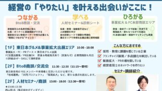 出展企業は4つのカテゴリー(食材、インフラ、設備機器、フランチャイズ)から選定されており、「飲食関連事業」を中心に、幅広い業界・業種の企業同士のマッチングを目指します。